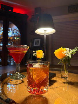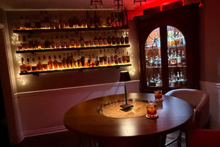Welcome to our bourbon haven, where a diverse selection of fine bourbons is elegantly displayed on handcrafted Michigan Cedar shelving. The warm ambiance created by our carefully curated lighting complements the rustic charm of our whiskey barrel table, inviting you to relax, savor and sip. Experience the perfect blend of craftsmanship and comfort in "The Sipping Room Speakeasy".